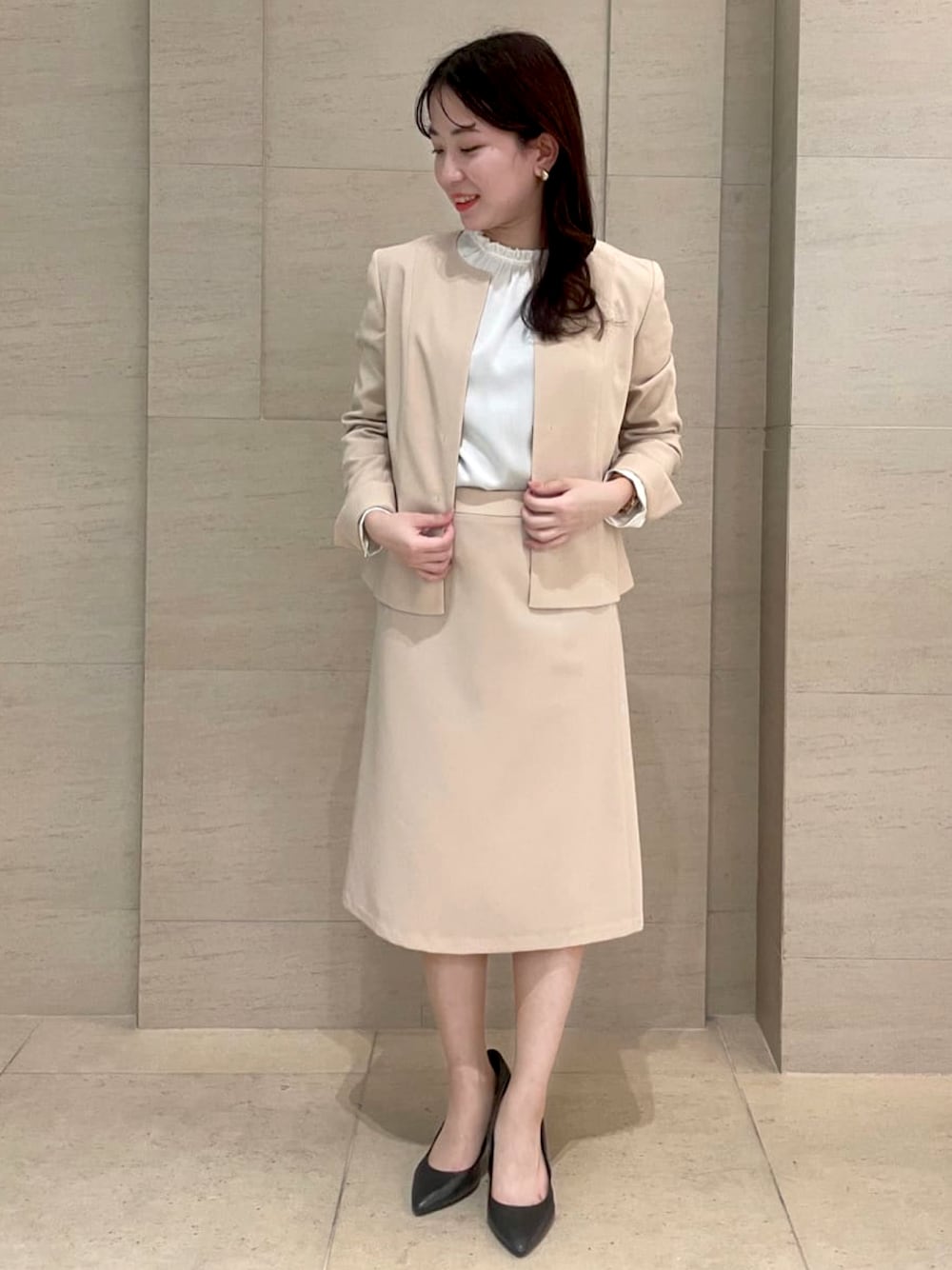 【モデル身長155cm】 セレモニーなどの特別な場にも、普段のオフィスにも。 汎用性が高く様々なシーンで着用できる ノーカラージャケットとフレアスカートです! 清涼感のある生地でシワになりにくく、自宅で手洗いできるのも魅力的です!