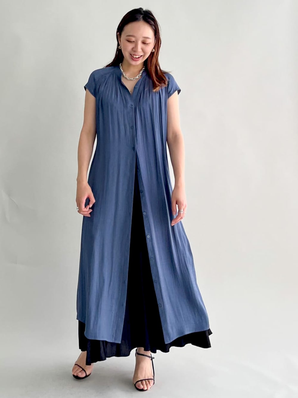 【モデル身長159cm】柔らかく、エレガントに揺れる素材のワンピースとスカート。 ワンピースは前がボタンになっているため、羽織としても活用いただけます! 今回はロングスカートをレイヤードして、トレンド感を意識してみました。 ワンピースはベルト付きなので、ウエストを絞ればきれいめに。 フレンチスリーブなので一枚で安心のデザインです!