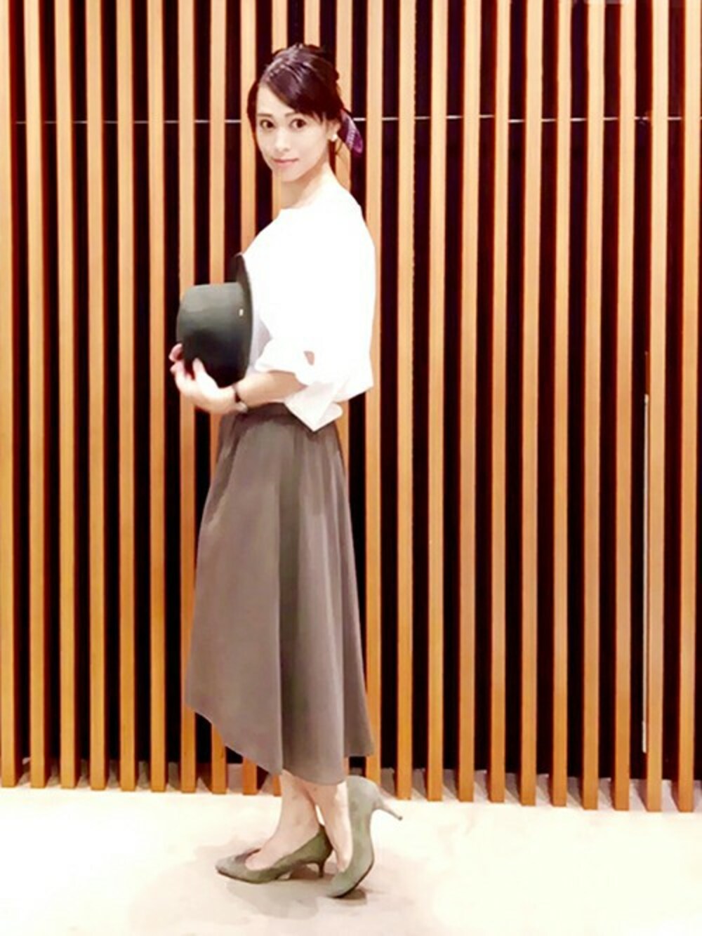柔らかな素材のカーキのスカートは、後ろが少し長いデザインで、歩く度に流れるような動きが出てエレガントな印象。 トレンドのオフショルダーのブラウスと、まとめ髪のポイントにバンダナ柄のスカーフをあわせました。