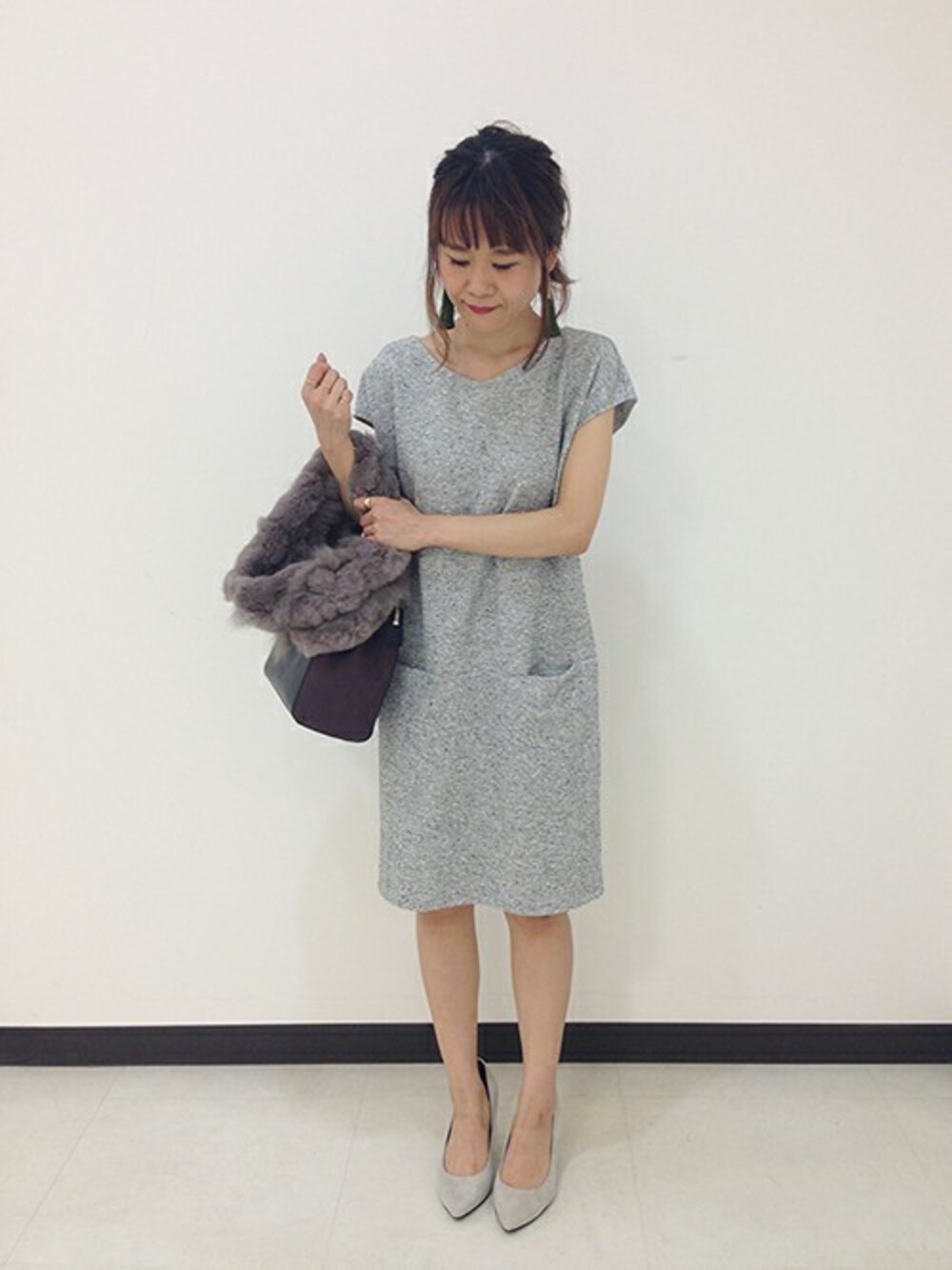サラリと着やすいワンピースは暑さの残るこの時期からピッタリです。 身長150cmの私で膝丈になり、オンでもオフでも着回せます。 ツイード調の素材が秋らしらを感じさせる一枚です。