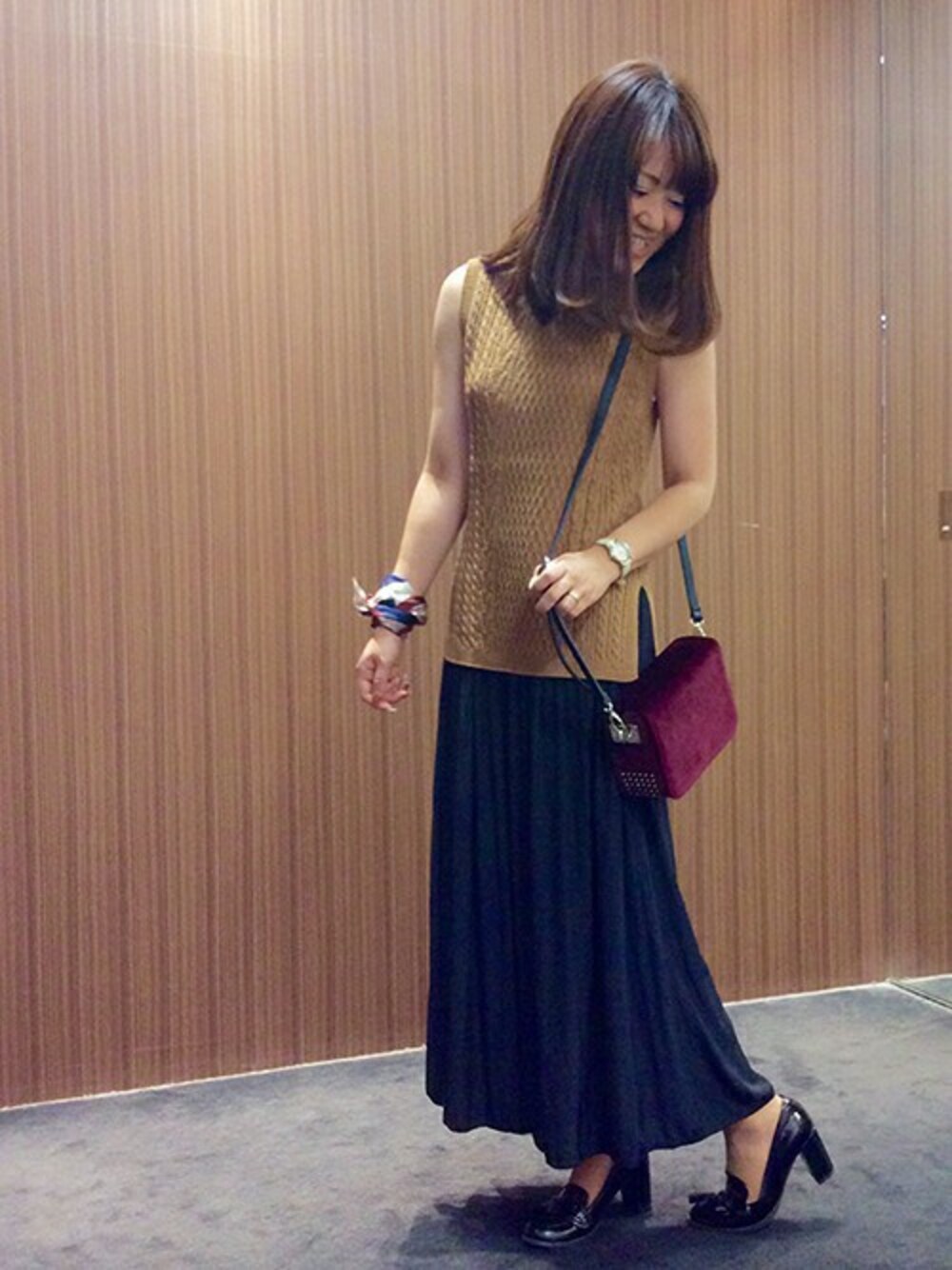 ロング&リーンの今年らしいスカーチョスタイリングです。 ケーブル編みのニットは、ふだん5号サイズを着ている私が1枚で着ても、シャツと重ね着しても着られる、適度にゆとりのあるサイズ感です。