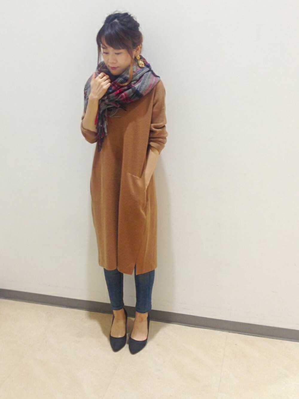 今年トレンドの丈長ニットに、スキニーデニムでスッキリ合わせました。 首もとは気温対策に、ストールでアクセントをつけています。 ニットはワンピースとしても着れるので、着回しが楽しめます。Sサイズの私でヒザ下ぐらいの着丈です。
