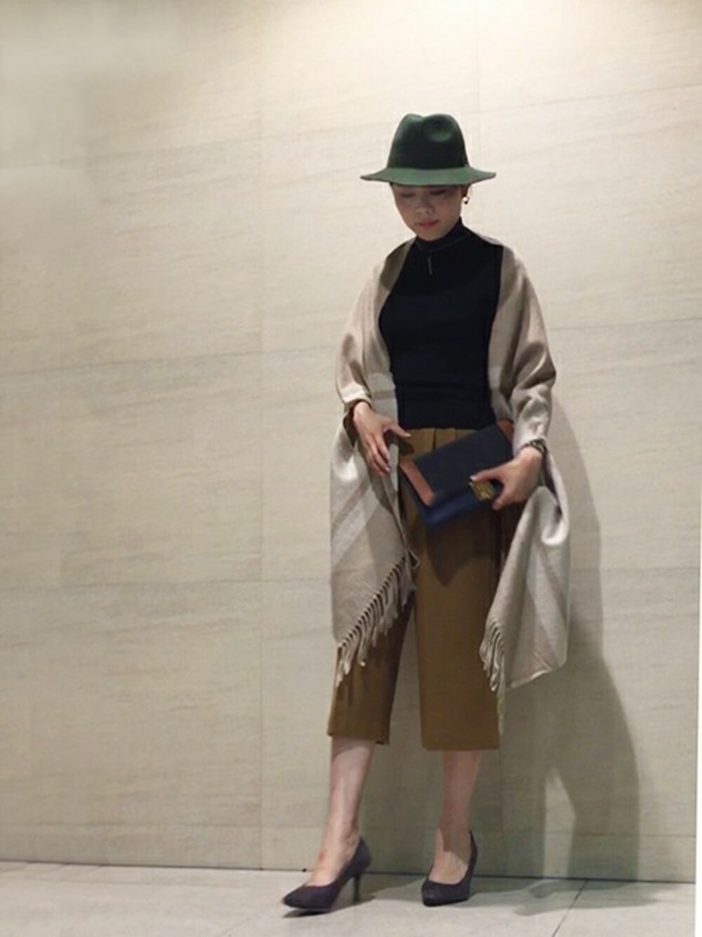 定番のガウチョパンツは、今年旬のキャメルを差し色に、黒のインナーを合わせてベーシックなコーディネートにしました。 大判のスリットポンチョを羽織れば、秋のお出かけスタイルの完成!