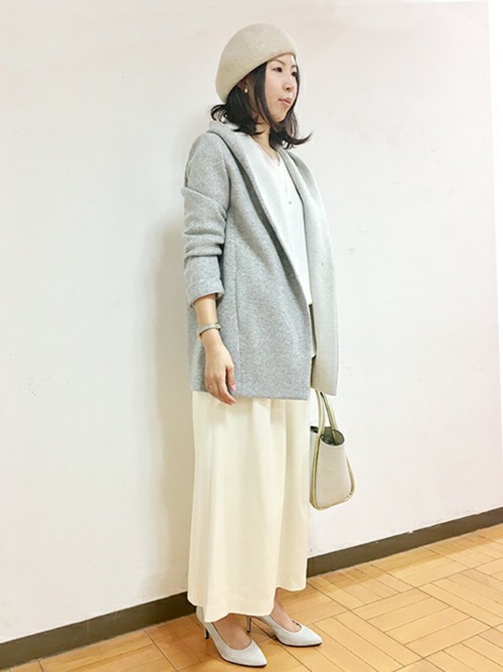 この時期マストのライトアウターは、ボトムを選ばない万能丈。身長163cmの私が着用して、お尻がスッポリ隠れる丈感です。 トレンドのワイドパンツをグレーと白のワントーンコーデで、女性らしく柔らかい雰囲気に仕上げました。