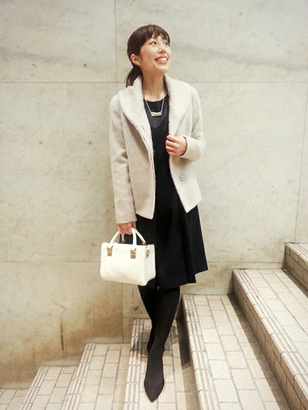 シャギーのジャケットはふんわりしていて女性らしく、冬のお出かけにピッタリです。 モノトーンで大人っぽくまとめました。