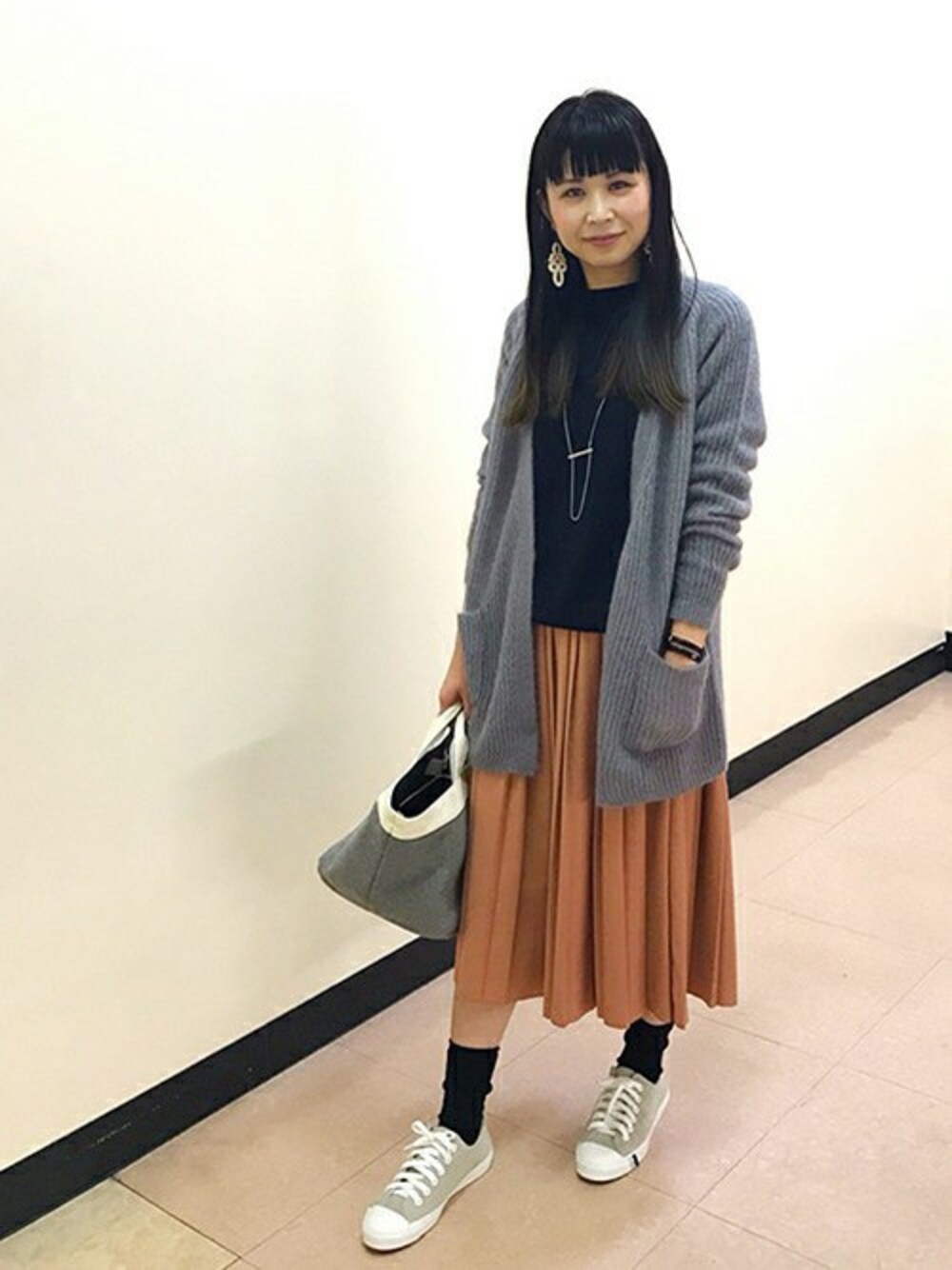 ヌガーカラーが今年らしいスカートはウエストゴムで、履き心地抜群です。 トートバッグやスニーカーを合わせて、カジュアルに仕上げました。 イベントの増える年末年始にオススメです!