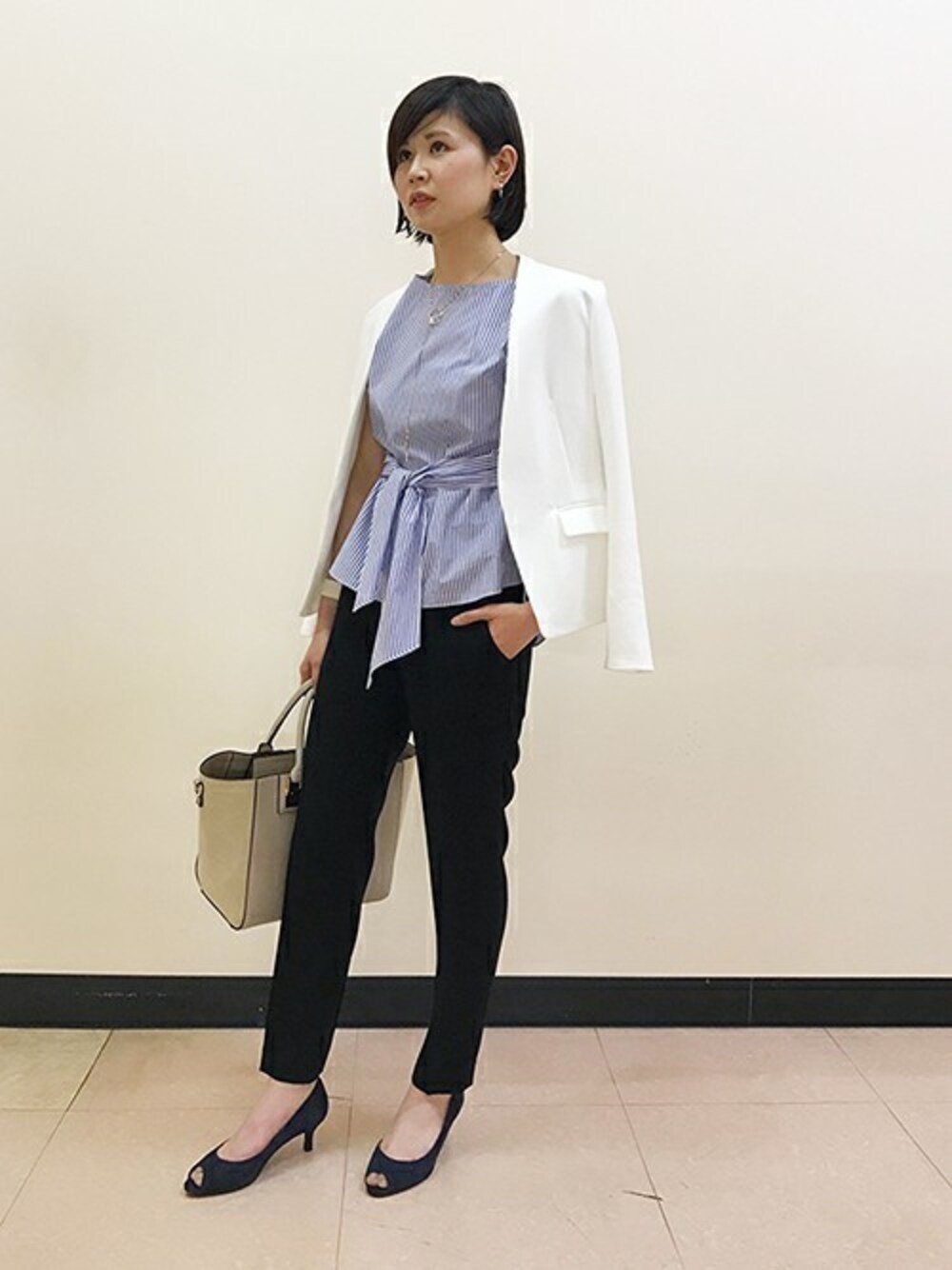 新年度のスタートにもおすすめの、ジャケットを使ったキレイめスタイルです。 伸縮性のある白のジャケットは着心地抜群です。ブラウス、クロップドパンツを合わせて、爽やかな通勤スタイリングの完成です。