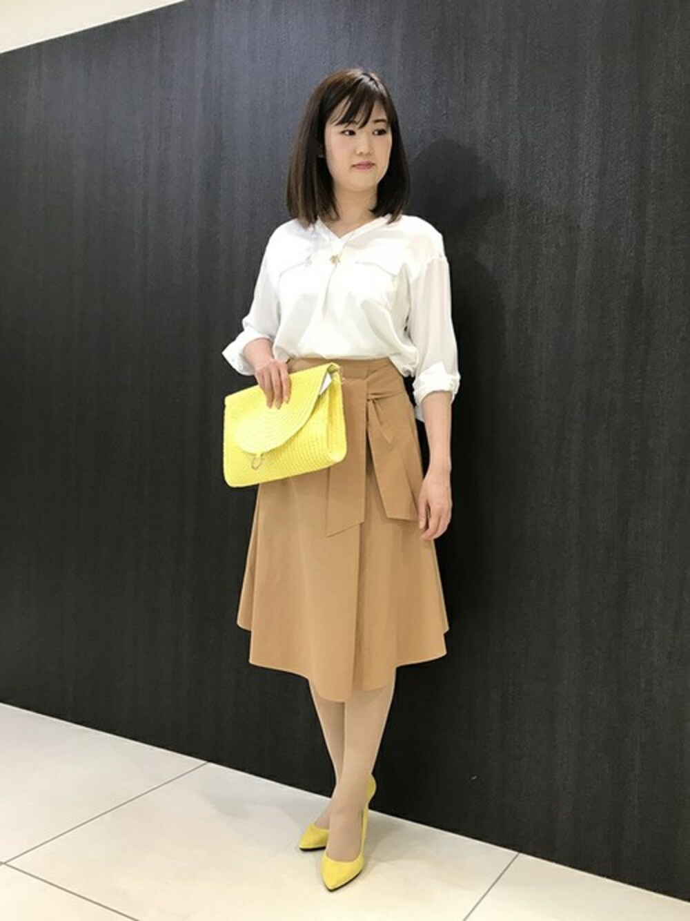 適度な光沢感のあるブラウスに、ヘムラインスカートを合わせ、女性らしいスタイリングにしました。 ウエストのリボンがお腹周りを美しくカバーしてくれます。洗える素材なのも、これからの季節に嬉しいアイテムです。