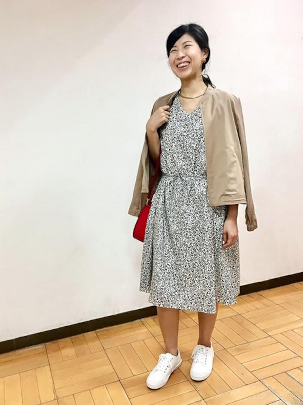 初夏らしい涼しげなモノトーンの小花柄ワンピーススタイルです。 カラーバッグを取り入れ、光沢のあるブルゾンとレザーのスニーカーで、 大人で上品な雰囲気を残しながら、抜け感のあるカジュアルスタイリングにしました。