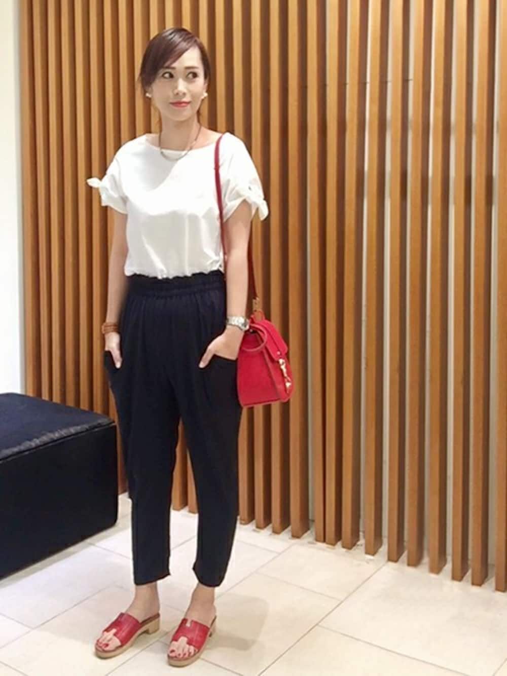 新作のテーパードパンツのスタイリングです。 サラッとした薄手の素材感で汗ばむ季節にも快適に着用いただけます。 ウエストはゴム仕様ながらインしても様になるデザインです。 甘さのあるブラウスと合わせて初夏らしいスタイリングにしました。