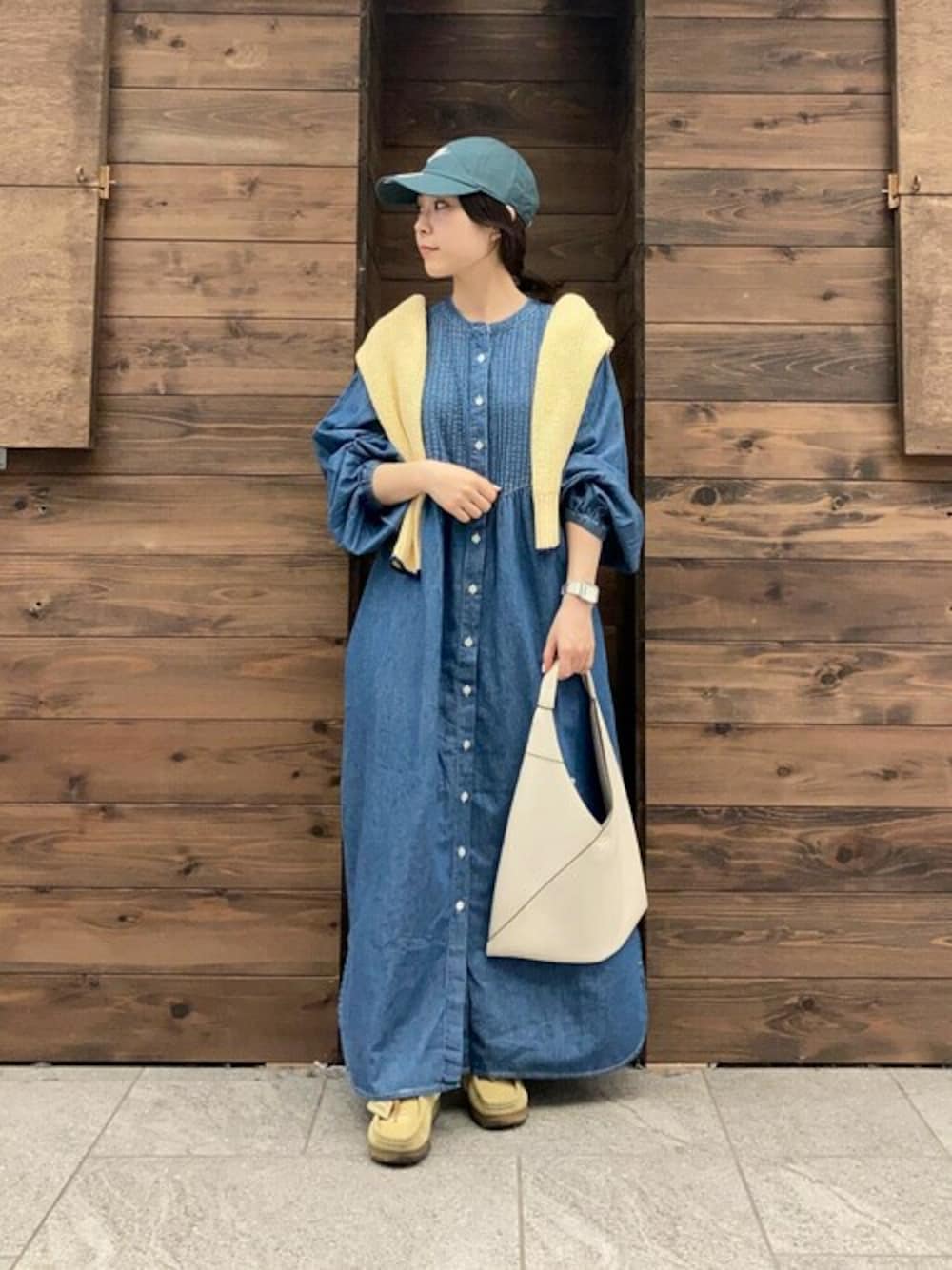 柔らかいデニム素材が着心地◎な ワンピースは少し高さのある 靴を合わせれば私の身長でも 合わせられました〜 袖のボリュームが可愛かったので カーディガンは袖を通さず 肩掛けスタイルで... ぜひ店頭でもサイズ感などお試しください