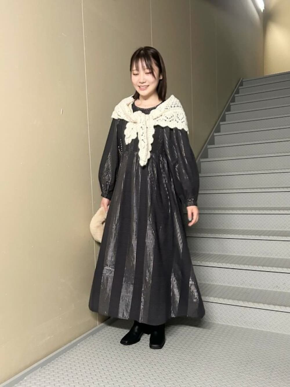 今回のテーマはおとぎ話に出てくる女の子をイメージしました❕ シャーリングシャイニーワンピースは揺れる度にギラギラして可愛らしいです◎ そのままだととても大人っぽい仕上がりですが、ニットストールを巻くことで可愛らしさがより引き立ちます❕ フェイクファーマイクロバッグは触り心地もよく、他のアイテムを引き立ててくれます❕ スクエアブーツは何にでも合いやすく、スタイル盛れが叶う商品です❕