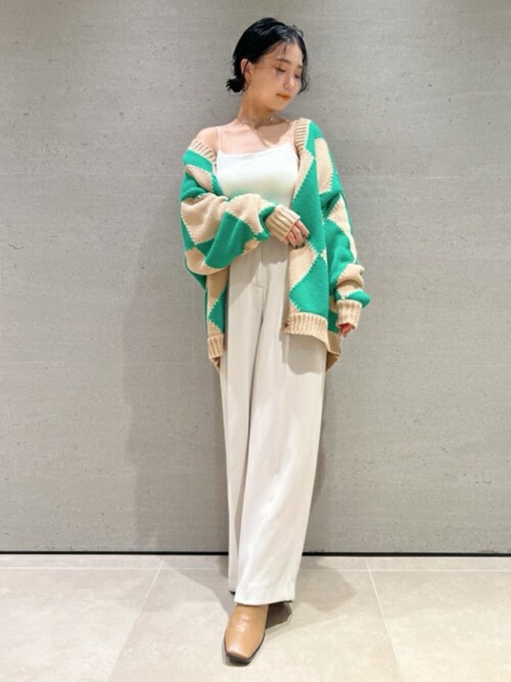身長:150cm/ 骨格タイプ:ストレート / パーソナルカラー:イエベ秋 【存在感のあるアーガイル模様が新鮮なニットカーディガン】 着用サイズ:F 一面に大きめのアーガイル模様を浮かべた、トラッドムード薫るニットカーディガン。 ざっくりとした風合いのローゲージニットを使用。 【今年らしいクラシックムードをプラスした定番ワイドパンツ】 着用サイズ:0 ゴールドのボタンをポイントにしてクラシックな雰囲気に。 バックウエストはゴム仕様なので程よい伸縮性があり、穿き心地も快適。 【今年らしいモード感を演出するスクエアトゥのショートブーツ】 着用サイズ:M スクエアトゥのエッジの効いたフォルムが印象的なショートブーツ。 ライニングには肌触りの良い柔らかな合皮と、厚地のクッションを採用し足への負担を軽減しています。 【華奢なストラップデザインが女性らしさを高めるブラレット&ショーツセット】 着用サイズ:M 肌触りの良い素材のベースにカップを縫い付けて仕上げた、快適な着用感が魅力のブラレットとショーツのセットアイテム。