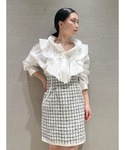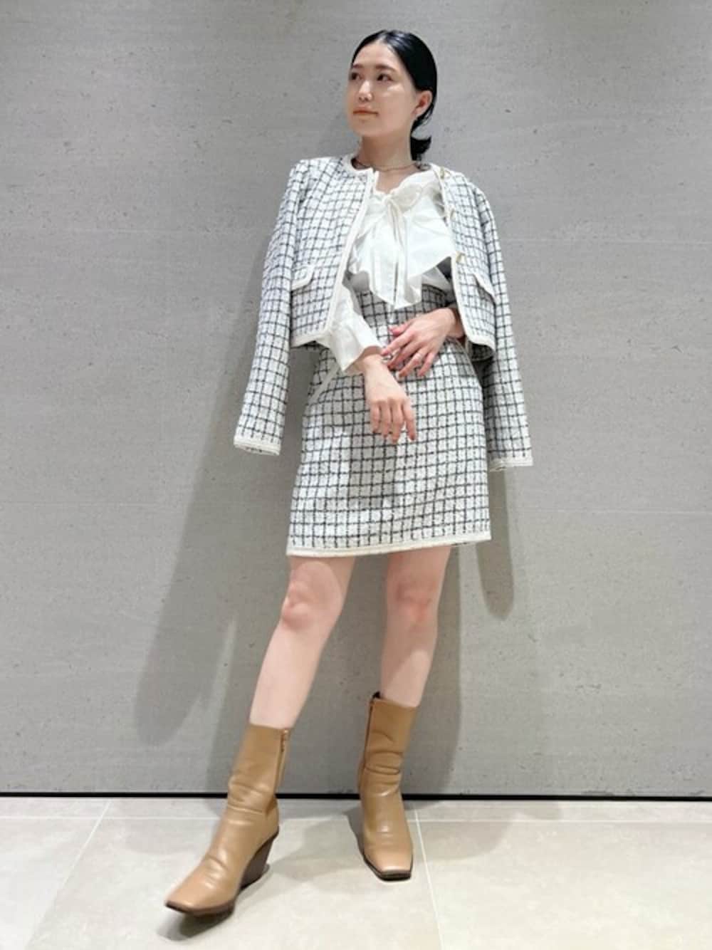 身長:150cm/ 骨格タイプ:ストレート / パーソナルカラー:イエベ秋 【プラスワンでトレンドスタイルが叶うツイードジャケット】 着用サイズ:F トレンドのツイードジャケットをコンパクトなショート丈で女性らしく仕上げました。 厚手のニットも着こめるよう身幅をやや大きめに設定しつつ、着ぶくれしないようパターンを工夫しました。 【プラスワンでトレンドスタイルが叶うツイードスカート】 着用サイズ:0 デザイン性のあるブレードのトリミングで今年らしく仕上げたツイードスカート。 スタイルアップを意識した着丈とシルエットにこだわり、大人が似合うミニスカートを実現。 【今年らしいフリルカラーが目を引くエレガントなブラウス】 着用サイズ:F 優雅に波打つ大きめのフリルが印象的な、フェミニンムード溢れるブラウス。 1枚ではもちろん、フロントを開ければ羽織としても着られ、幅広いスタイリングに活躍してくれます。 【今年らしいモード感を演出するスクエアトゥのショートブーツ】 着用サイズ:M スクエアトゥのエッジの効いたフォルムが印象的なショートブーツ。 ライニングには肌触りの良い柔らかな合皮と、厚地のクッションを採用し足への負担を軽減しています。