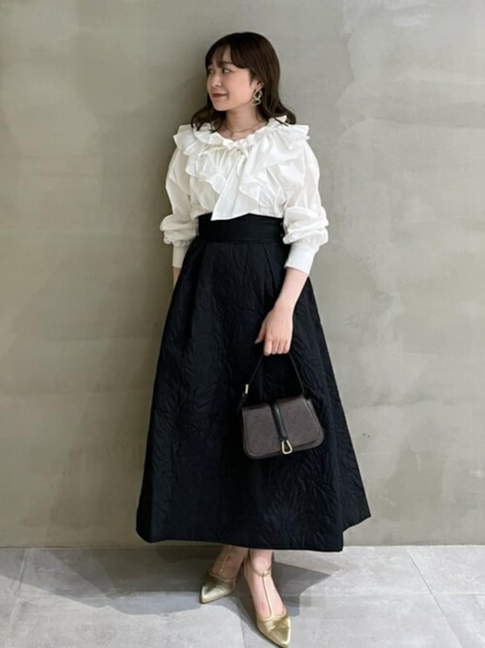 身長:155cm/ 骨格タイプ:ストレート / パーソナルカラー:ブルべ夏 【今年らしいフリルカラーが目を引くエレガントなブラウス】 着用サイズ:F 優雅に波打つ大きめのフリルが印象的な、フェミニンムード溢れるブラウス。 フロントを開ければ羽織としても着られ、幅広いスタイリングに活躍してくれます。 【オリジナルのキルティング模様で個性を添える中綿入りスカート】 着用サイズ:F 「LILY BROWN」オリジナルのボタニカルなキルティングステッチが印象的なスカート。 バックウエストのゴムシャーリングとリボンでサイズ調整可能。 【品の良いデザインで幅広いスタイリングにマッチするストラップパンプス】 着用サイズ:M ハートをモチーフにしたカットデザインとTストラップがマッチした、クラシカルな印象のパンプス。 6cmのヒールに、ソールには厚地のクッションを使用し足への負担を軽減しています。 【トレンド感のあるマイクロサイズのショルダーバッグ】 着用サイズ:F 3つの素材で異なる表情に仕上げたバリエーションデザインのショルダーバッグ。 たくさんのポケットを備えiPhone Pro Maxが横にすっぽりと収まるサイズ感で、実用性は◎。