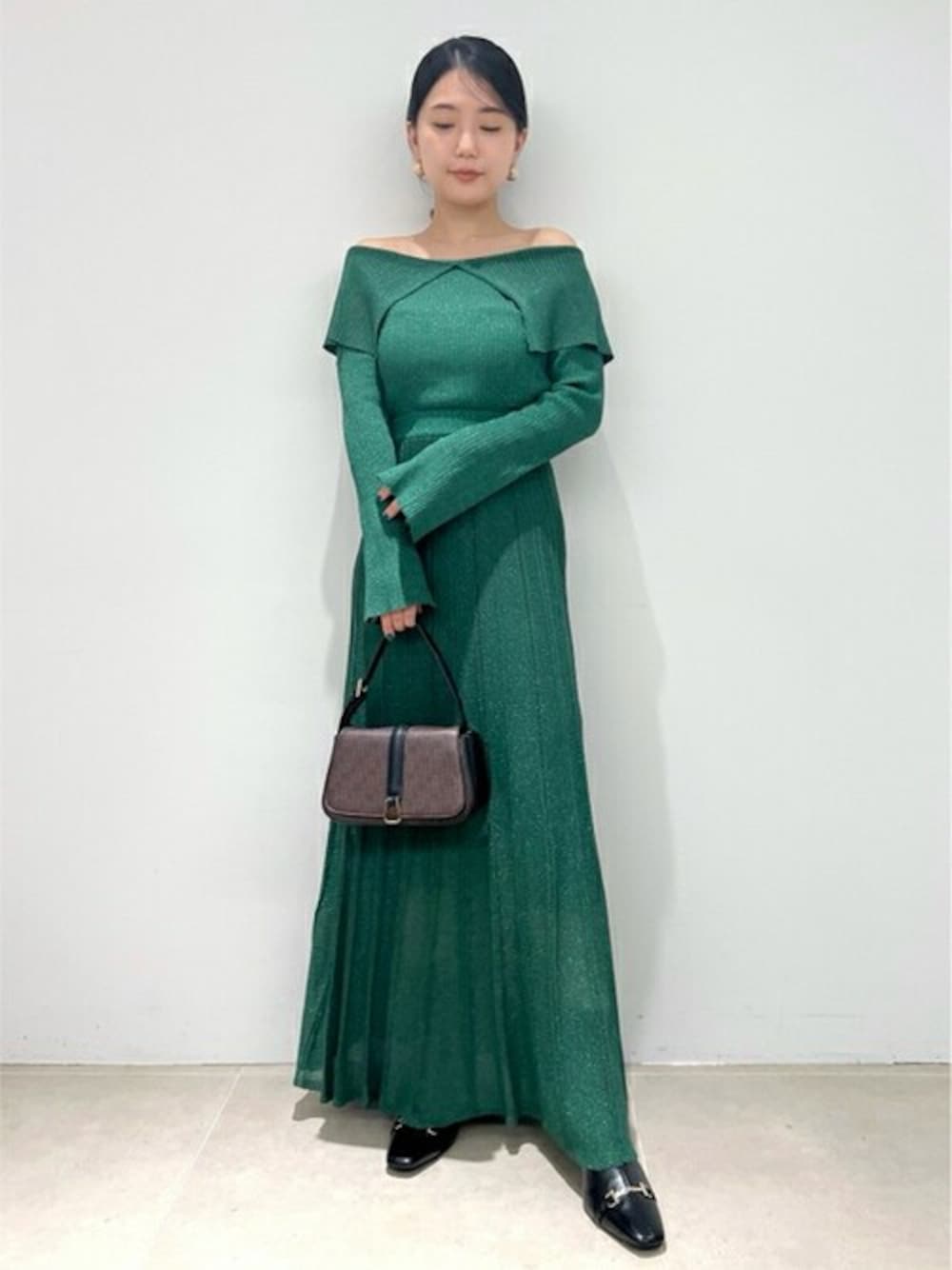 身長:150cm/ 骨格タイプ:ストレート / パーソナルカラー:イエベ秋 【ラメが織り込まれた糸を全面に使用し、軽やかさと華やかさを併せ持つニットロングOP】 着用サイズ:F ケープのようにあしらわれた襟元は後ろが割れており、前後着用可能で見せ方を変えられます。 ショルダーストラップは取り外し可能。 ストラップレスで着用するとよりデコルテを美しく演出できます。 【シンプルな中に映えるビットモチーフが印象的なショートブーツ】 着用サイズ:L アッパーにあしらわれたビットが目を引く、モードな印象のショートブーツ。 つま先は控えめなスクエアフォルムにすることで、上品かつスマートなルックスに。 【トレンド感のあるマイクロサイズのショルダーバッグ】 着用サイズ:F 3つの素材で異なる表情に仕上げたバリエーションデザインのショルダーバッグ。 コンパクトな見た目ながら、たくさんのポケットを備えiPhone Pro Maxが横に すっぽりと収まるサイズ感なので、毎日の必需品はしっかりと収納でき実用性は◎です。