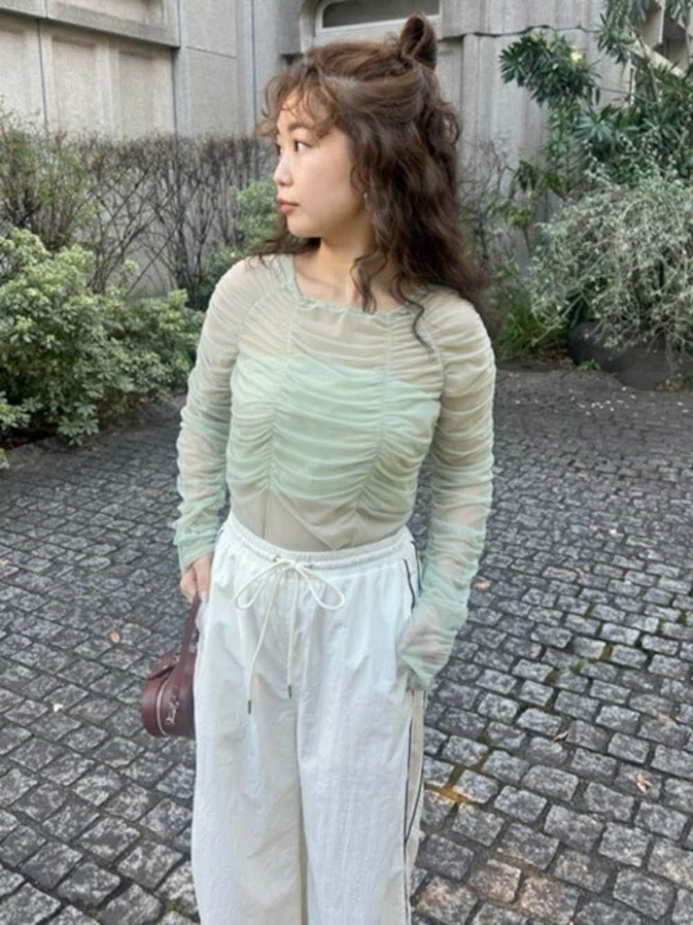 身長:152cm/骨格タイプ:ストレート/パーソナルカラー:イエベ秋 【旬の肌見せスタイリングが完成するシアーギャザーチュールトップス】 着用サイズ:F 柔らかく身体を包み込むようなチュールギャザーが女性らしいシアートップス。ネックラインにゴムが入っているので、肩を落としてオフショルダーとしても着用可能です。中にカップ付きのバンドゥをつけているため、インナーを気にせず1枚で感度の高い肌見せのスタイリングが完成します。全体にふんわりギャザーを寄せることで身体にフィットしすぎずスタイルアップにも貢献。シンプルなデザインは合わせるボトムを選ばず、幅広いコーディネートに活躍します。 【トレンドのトラックパンツをスリットとシルエットでレディに格上げ】 着用サイズ:F トレンドのトラックパンツに、ドットボタンでサイドスリットを入れ抜け感をプラスした1着。ストンと落ちるワイドストレートシルエットが大人な雰囲気を醸し、スポーティなデザインでありながら女性らしい印象をしっかりと持たせています。ウエストはゴムと紐仕様で着脱もイージーに。さり気ない左腰の刺繍がアクセントです。フェミニンなトップスやマニッシュなジャケットと合わせた、ミックススタイルがおすすめです。