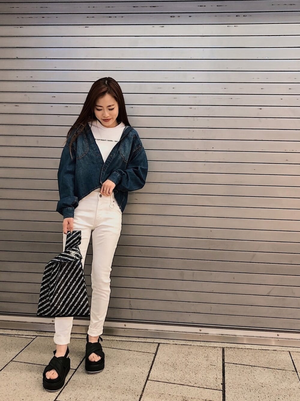 春を意識したコーデ☆ ホワイトでまとめ、 デニムシャツで少し大人っぽく◎ カバンはロゴBAGでTシャツのロゴと 合わせました✨ 春夏と使えるオシャレなデザイン!! 厚底サンダルで足長効果も😌✨ 春を通り越して夏が待ち遠しいですね♩