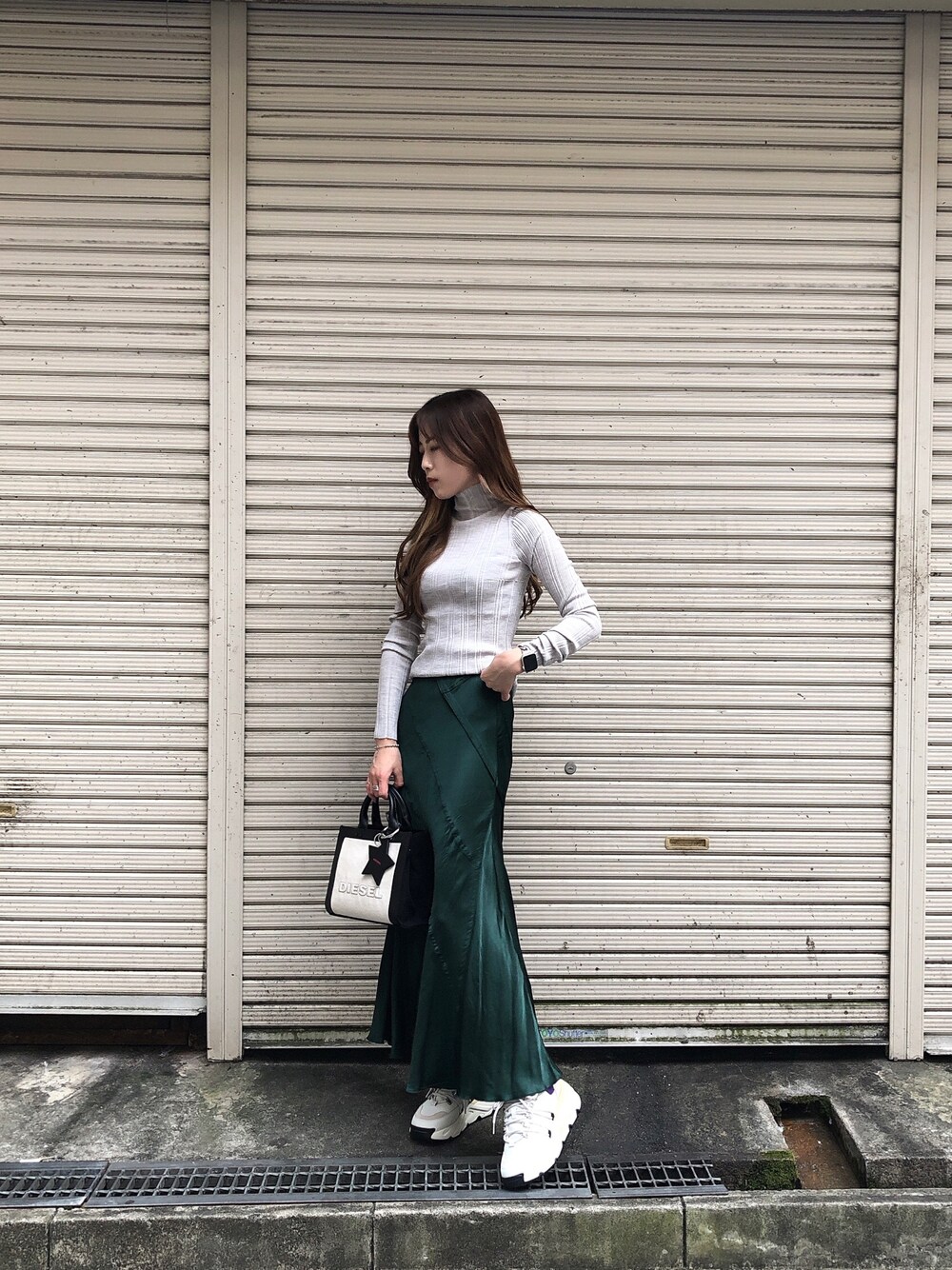 トレンドカラーのスカートに シンプルなニット合わせで、 スニーカー👟で外してみました🥺🧡🤎 秋服は可愛いな〜🥺🎈