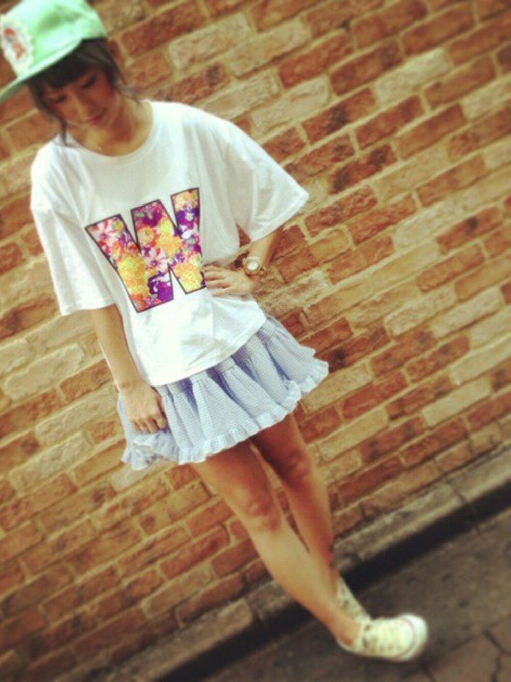 ビッグなサイズ感にフロント部は花で彩られたWのロゴのTEEです。こちら店舗先行販売アイテムとなっています!ギンガムチェックのパニエでガーリーさを出しつつ、CAPとスニーカーでカジュアルさも♪ CAPにはレースがあしらわれてるので、甘めのコーデにも使いやすいです◎