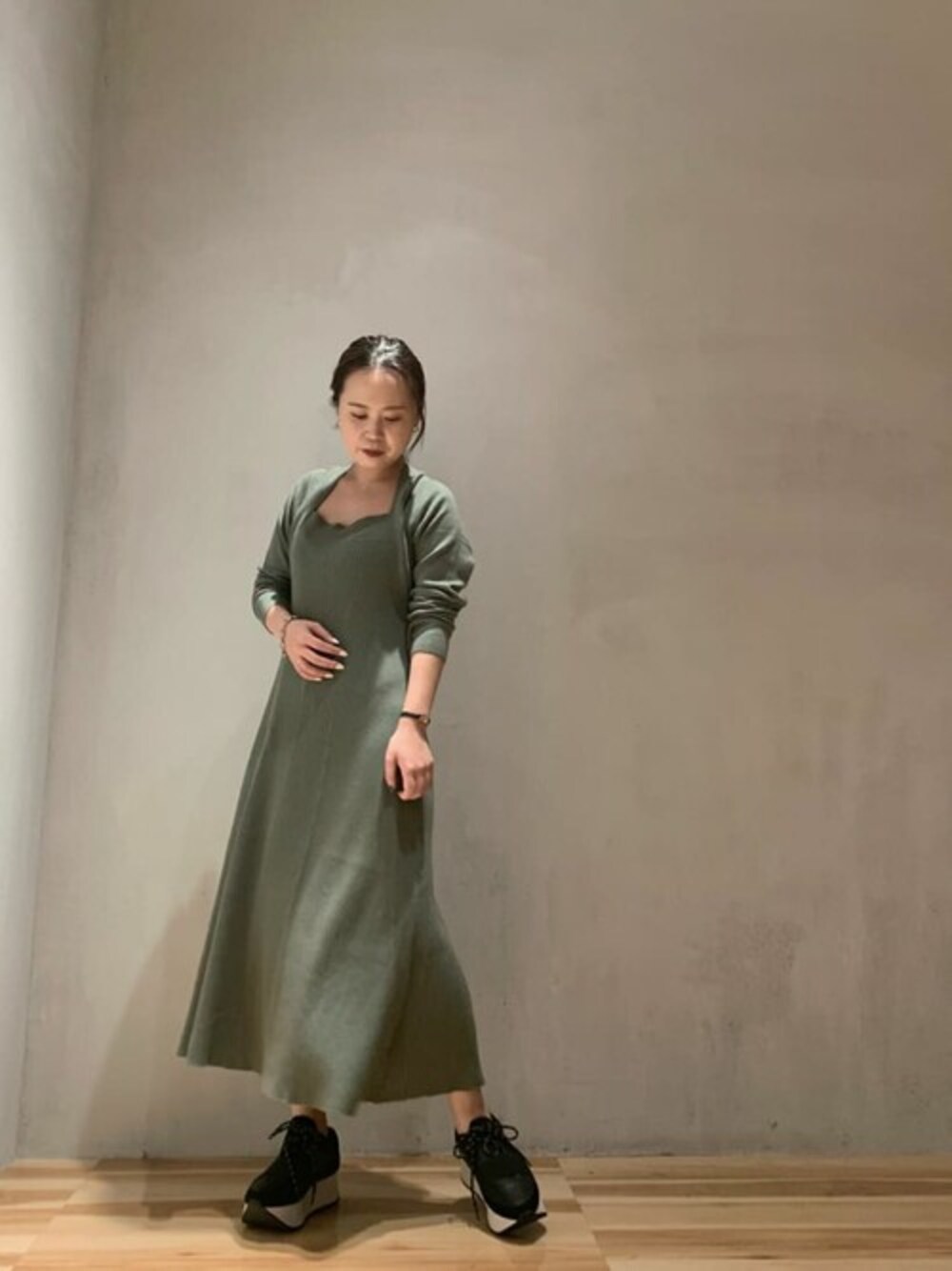 1枚でレディライクが叶うニットワンピ◎カーディガンを羽織っているように見えるレイヤードアイテムです。デコルテがきれいに見えるスクエアデザイン◎落ち感がとってもきれいなので美シルエットが完成します。お袖のボリュームが控えめなので、アウター合わせも困りません。155cmで01サイズ着用です!