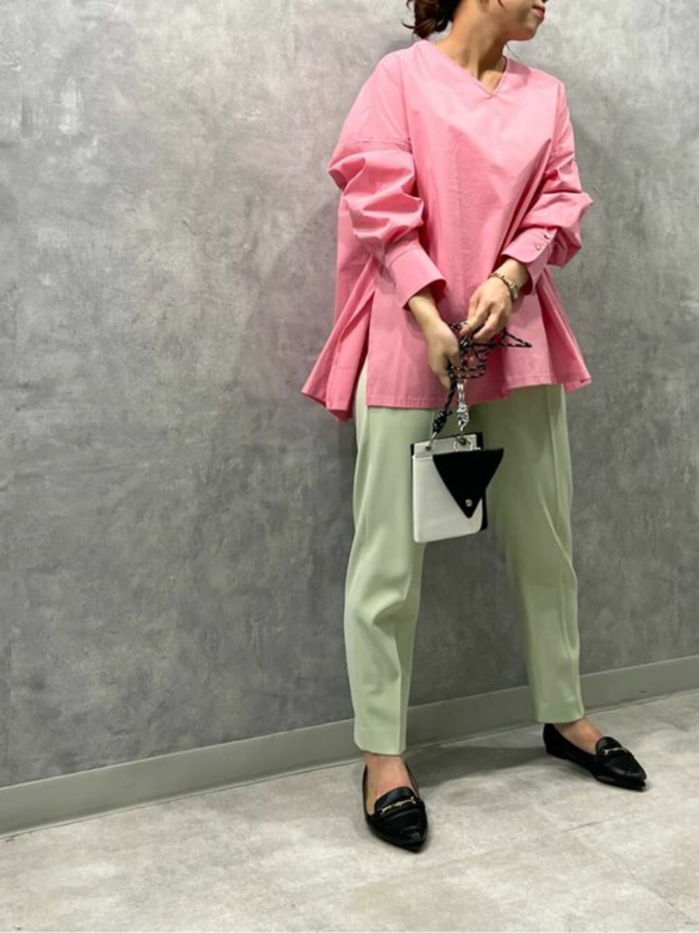 バックスタイルが可愛いブラウスは動く度にふわっと揺れて着映え効果抜群。全体的にゆったりとしているので、体型カバーもしてくれます◎。シンプルなデザインなので、パンツ、スカートと着回し力も高くオススメです。 大人気テーパードパンツの新作が登場*̣̩⋆̩つるっとした生地でストレッチが効いているので履きやすく、足の曲げ伸ばしも楽ちんです。ウエストから真っ直ぐ入ったセンタープレスが美脚見せしてくれます。 春らしい組み合わせで大人のカラーコーデに仕上げました。