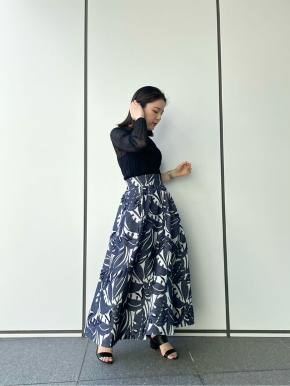 季節感のあるリーフ柄のスカート! 柄の所々にフリンジをあしらったこだわりのデザイン。 立体感のあるキレイなシルエットでハイウエストなのでスタイルアップ効果抜群! シンプルなトップスとのコーディネートがおすすめです。 合わせたシアーニットは、程良い透け感で大人っぽくトレンドを取り入れられるアイテム。