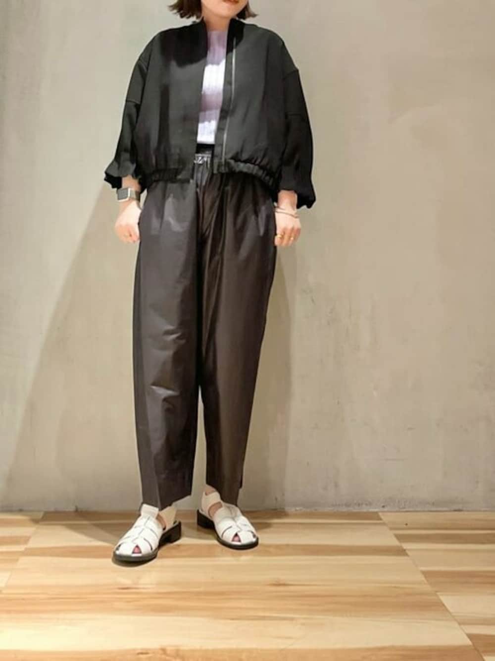 【アウター】 手触りやわらかなブルゾンは季節問わずお召しいただけます◎ ゆるっとしたシルエットでカジュアルになりすぎず、大人っぽい印象に。お袖のデザインもポイント◎ 【ニット】 透け感のある薄手のニットは夏にも着れちゃう優れもの。 【ボトムス】 ELENDEEKの定番パンツ。 光沢のある柔らかなお素材で履き心地ばつぐん。 ウエストがゴムなのでインスタイルもらくらく。 155cm01サイズ着用。