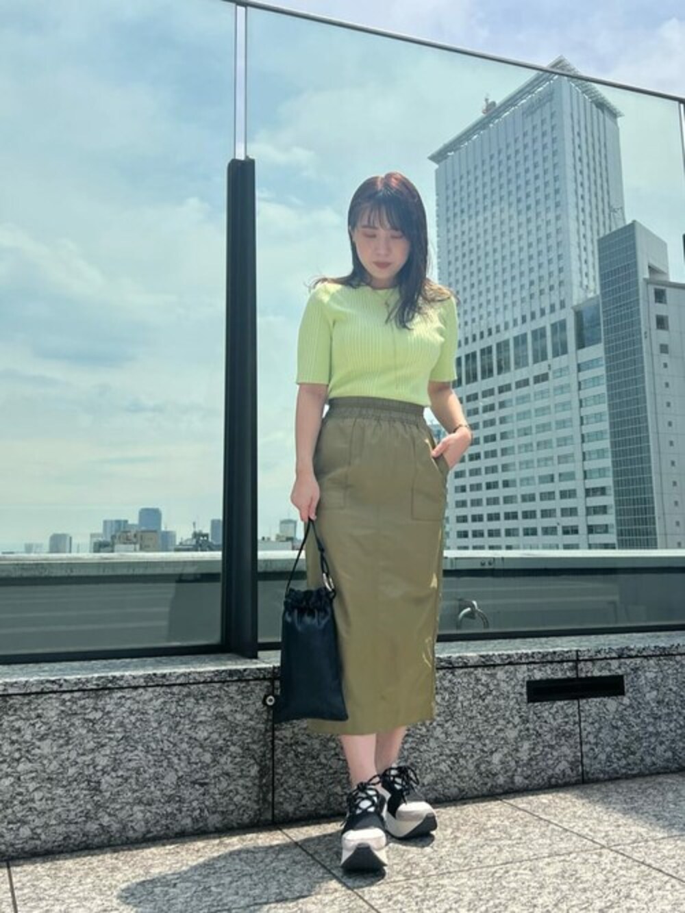 【スカート】 シャカシャカとした生地で、毎日でも履きたくなる涼しさ抜群のスカート◎! チンツ加工で微光沢感のある素材が、カジュアルになり過ぎず程よくキレイめに見せてくれます。 【トップス】 レーヨン混のリブニットは、サラッとした着心地でチクチクもせずtシャツ感覚で着まわせる優秀アイテム。 リブの細さが違うことで細見え効果抜群です! 大人気のスニーカーでスポーティーミックスコーデに仕上げました。