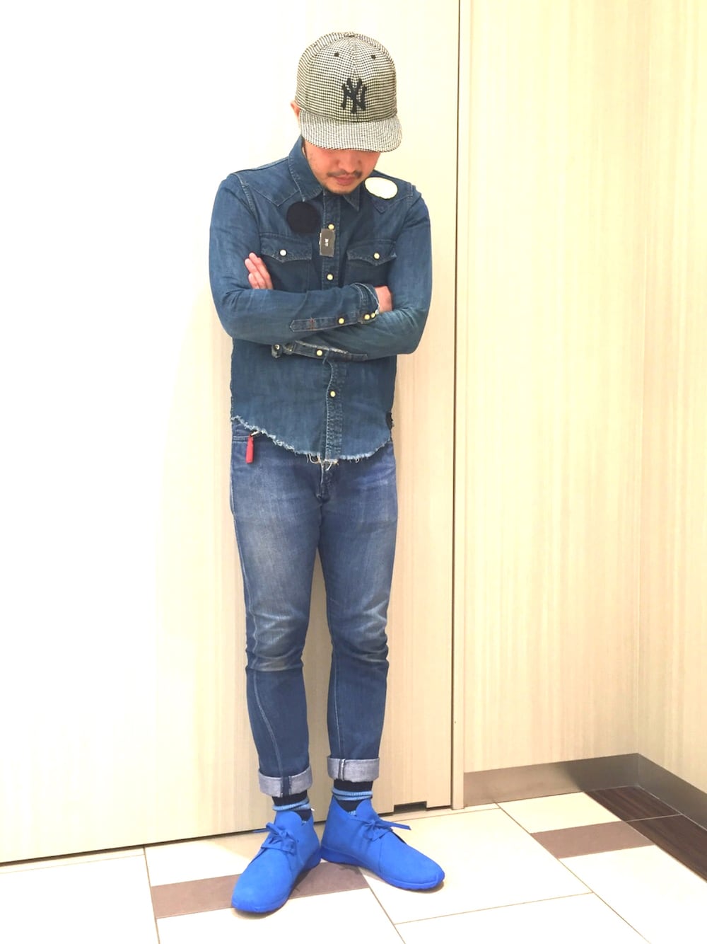オールブルーです。 インポートブランドならではの配色。 コーディネートは難しいかもしれませんが、これからの季節これくらい派手な方が 良いかと思います。 商品は素材にマイクロファイバーを使用しており、驚くほどに軽くて気持ちが良いです。 オススメです。 店舗でも販売しておりますのでお近くお越しの際はぜひお立ち寄りください。