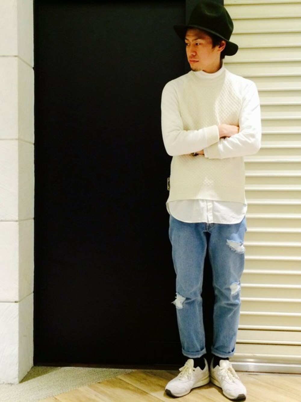 トップスはいつものタートルにロングシャツ。 ニットは袖がスウェットの大人気ニットです! パンツは新作、ダメージデニム。 今シーズンの注目トレンドアイテムですよ〜