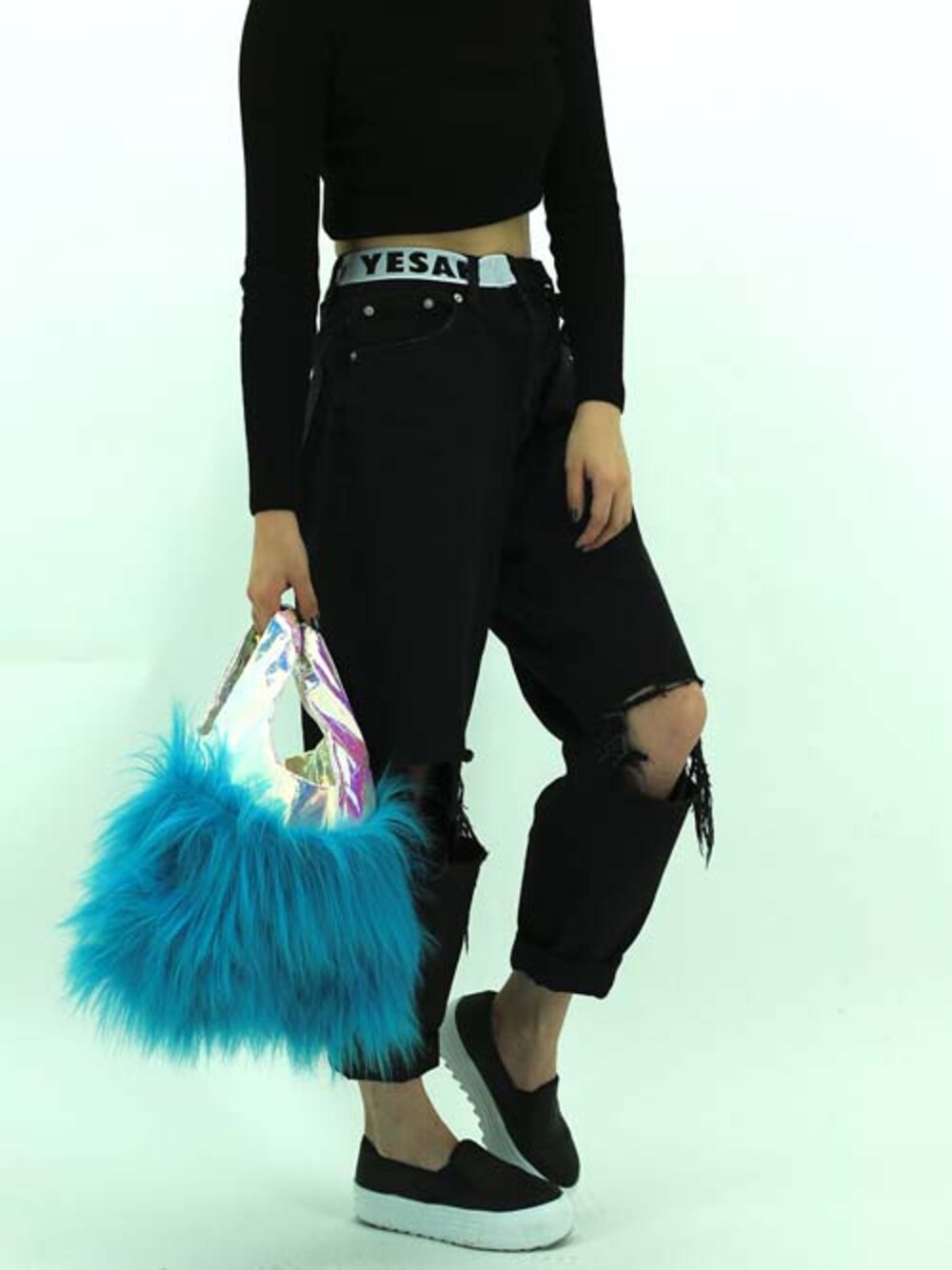 YESAHのトートバッグ「Mini Fur Tote Blue」を使ったコーディネート