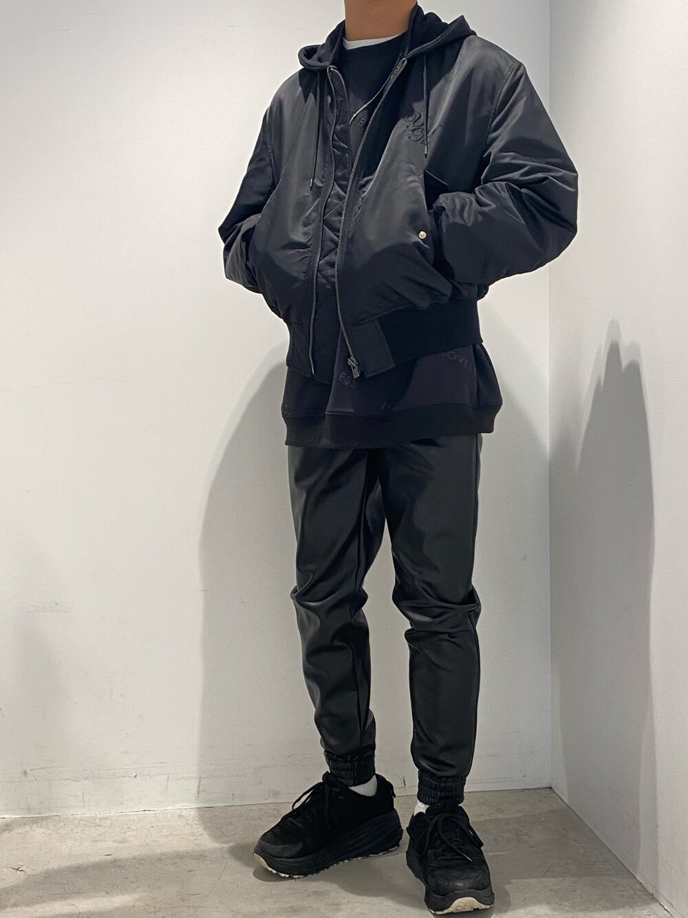 トレンドアイテムのMA-1を使用した、オールブラックコーデ。