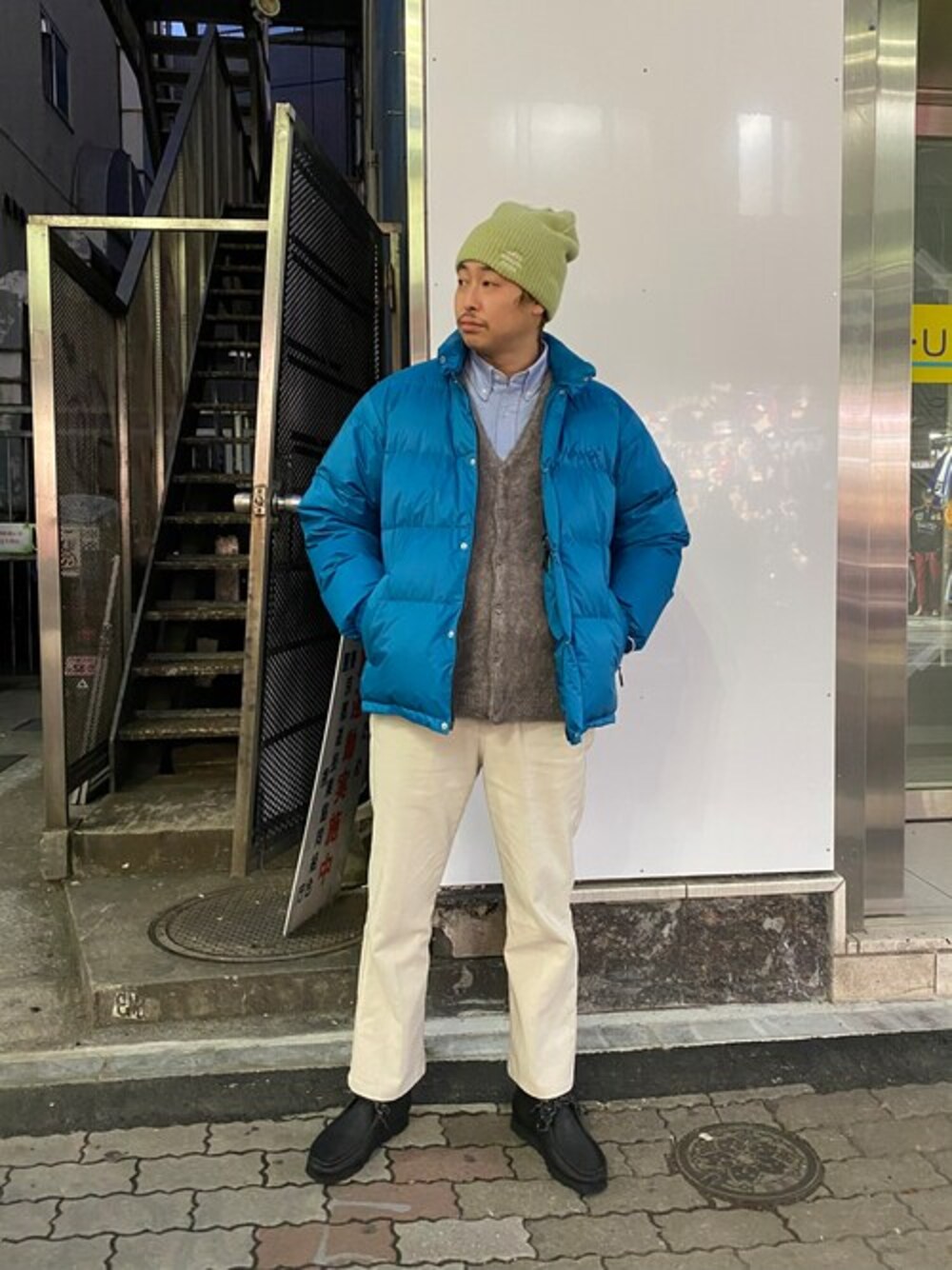 【大人のクラシックアウトドアスタイル】 ダンディポイントはインナーのシャツと白パンツ。 カジュアルなアウトドアブランドの洋服こそ襟元に気を使い、清潔感のある白を見に纏いましょう。 ダウンジャケットとカーディガンのレイヤードで暖かく・ダウンを脱いでもカッコよく過ごせます。 ダンディの足元にはやっぱり革靴が必要不可欠。 履き心地も最高なクラークスがおすすめです。 アウター:NANGA×BEAVER Mサイズ 少しゆったり カーディガン:MANASTASH Lサイズ キャップ:POLER Fサイズ シューズ:CLARKS UK7.5