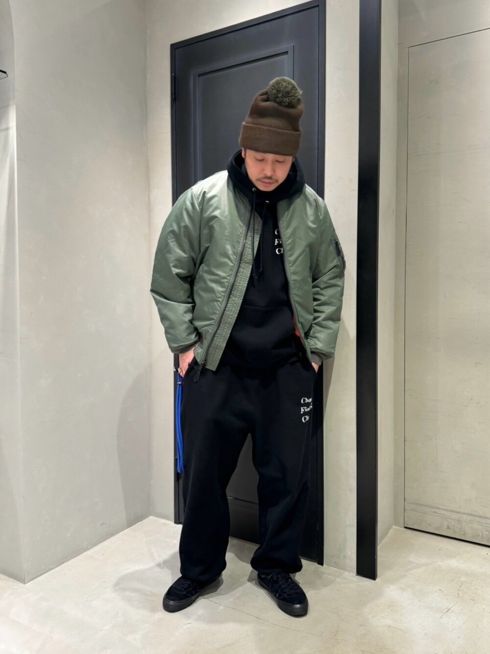 【Chaos Fishing Club × AVIREX】 今季イチオシのコラボレーションジャケットが入荷しています。 MA-1にロゴがプリントされたデザインなのでシンプルに合わせやすいアイテムです! 王道なスウェットセットアップにざっくり羽織りたいですね。 ジャケット:Chaos Fishing Club × AVIREX XLサイズ ゆったりめ トップス:Chaos Fishing Club Lサイズ 少しゆったりめ パンツ:Chaos Fishing Club XLサイズ ゆったりめ スマホストラップ:TOPOLOGIE