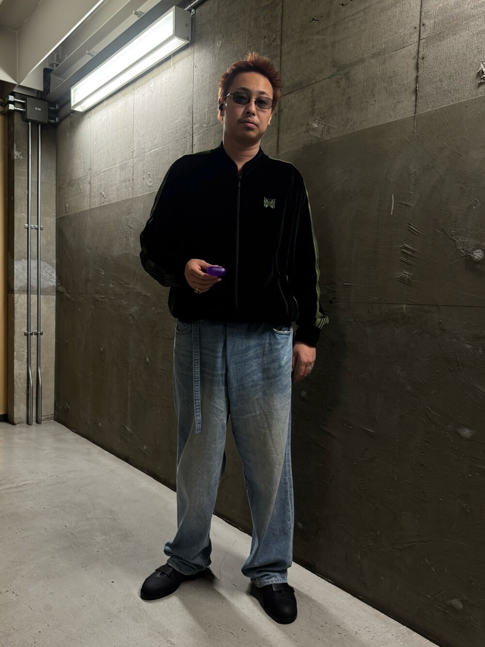 NEEDLESの25FW新作を使用したコーディネートです。 ベロアの素材感とデニムがナイスマッチです! アクセントにイヤホンもコーディネートしちゃいましょう。 ジャケット:NEEDLES Lサイズ 少しゆったり イヤホン:Jlab