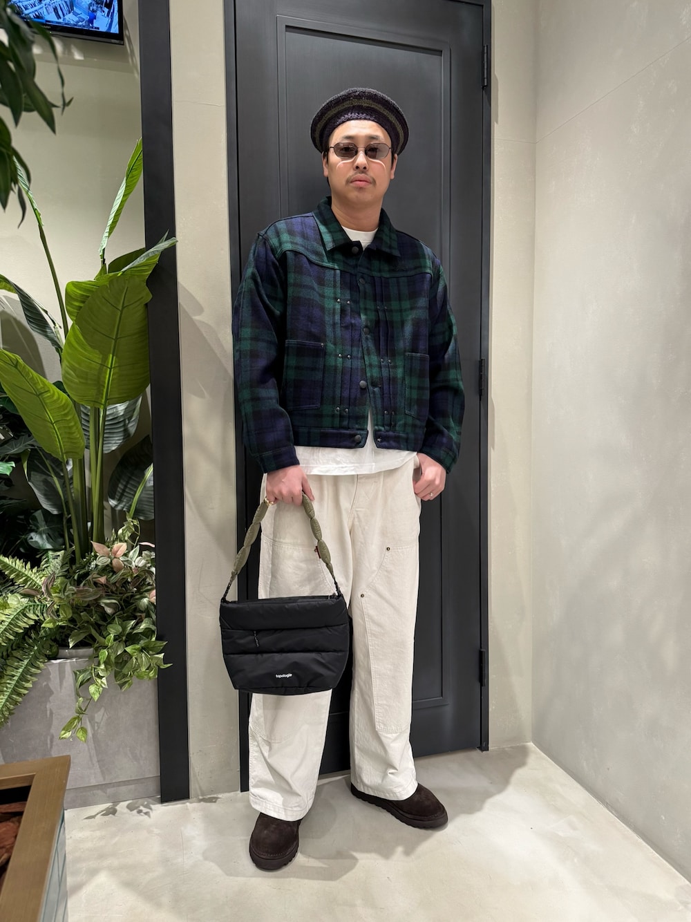 NEEDLES×BEAVERの別注ウールジャケットを使用したコーディネートです。 クラシックなブラックウォッチチェックのウール生地をGジャン型に落とし込んでいます。 ウールの生地感も厚すぎず薄すぎずなので、カーディガンくらいの感覚で使ってもらえるアイテムです。 ジャケット:NEEDLES Mサイズ 少しゆったりめ バッグ:Topologie