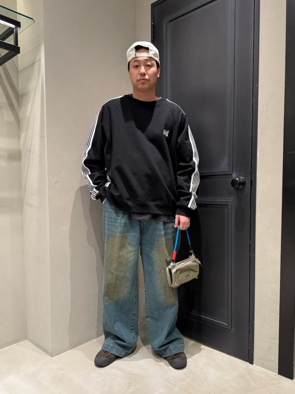 春夏のNEEDLES別注第一弾はスウェット素材のコレクションです。 クルーネックタイプはラインが入る事でシンプルになりすぎず重宝します! トップス:NEEDLES Lサイズ 少しゆったりめ パンツ:Bomnivore XLサイズ ゆったりめ バッグ:Topologie