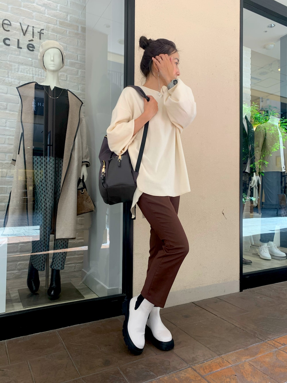 ワッフルの気持ちのいいトップスに細身パンツで大人カジュアルな装い! 足元はパンチのあるブーツでトレンド意識しました♪
