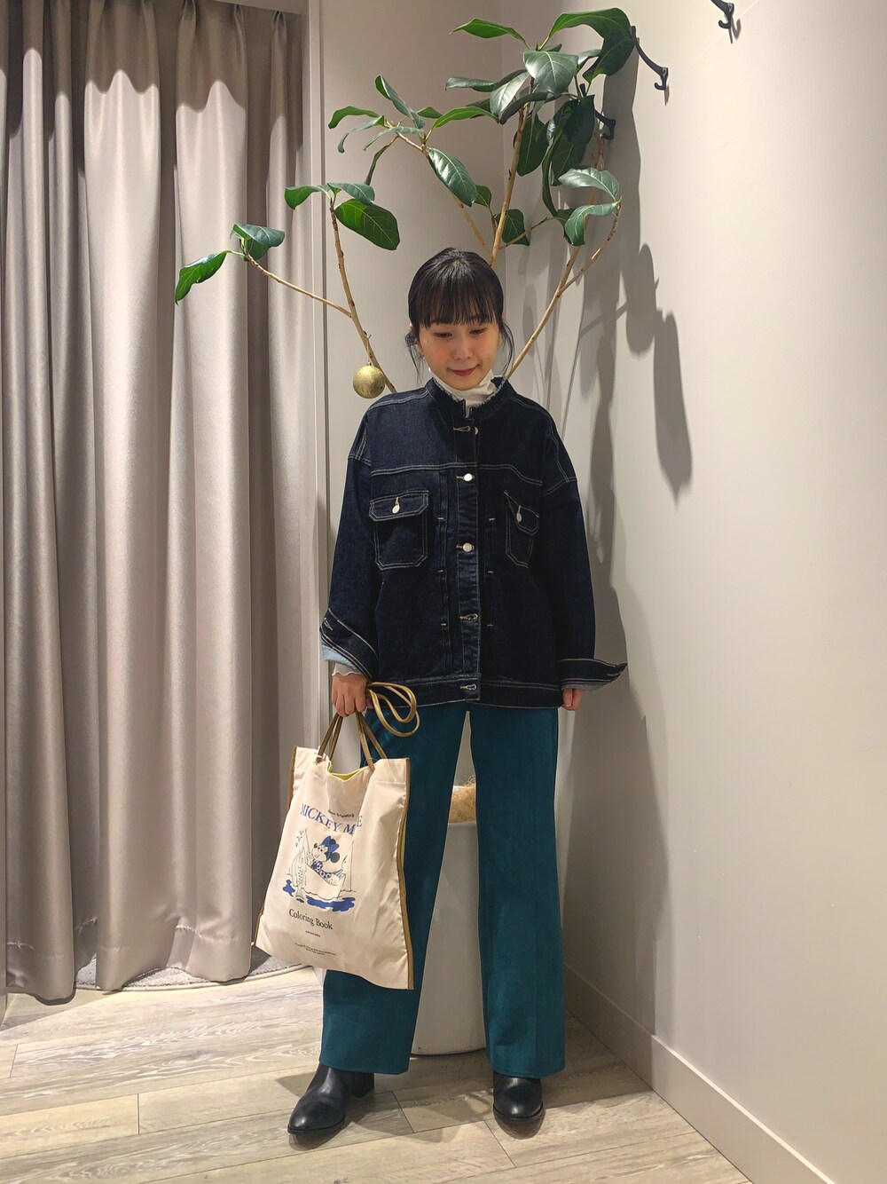 オーバーサイズのデニムブルゾンには、カラーパンツがおすすめです!