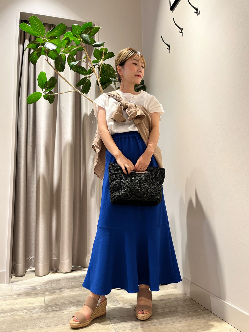マーメイドシルエットのロングスカートには、シンプルなTシャツで爽やかな印象に!