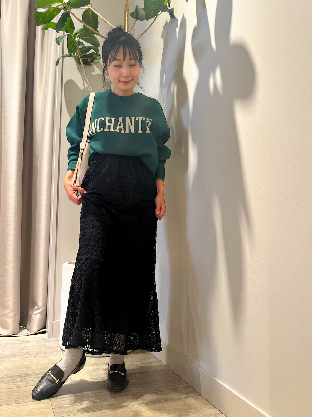 スウェット風のニットプルオーバーは、今の時期にピッタリのアイテムです! レースのスカートとも相性ぴったり!