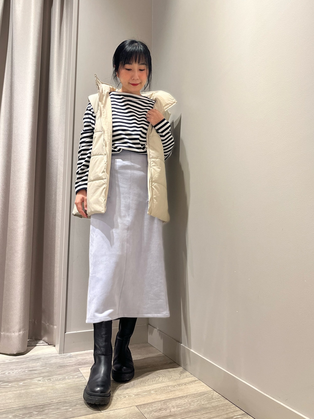 遠藤 裕子(アバハウスルージュヴィフラクレ三井アウトレットパーク 滋賀竜王店(LADIE'S))のダウンベスト「フェイクレザーナイロン中綿ベスト」を使ったコーディネート