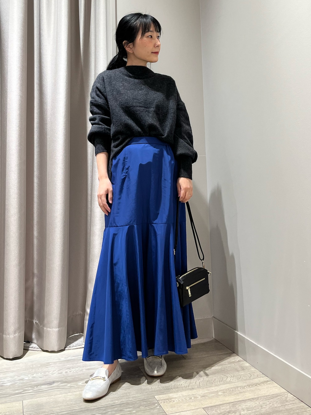 ふわふわニットに光沢あるロングスカートのお出かけに使えるコーデ! 裾から広がるシルエットがスタイルアップしてくれます!