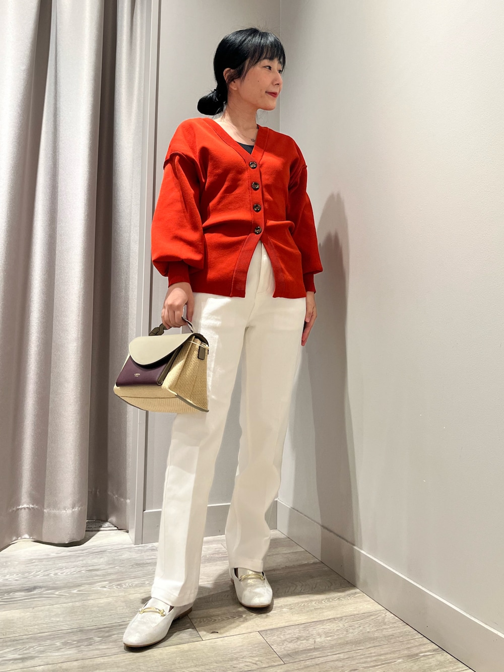 デザインのあるカーディガンにはシンプルなホワイトデニムがぴったりです!