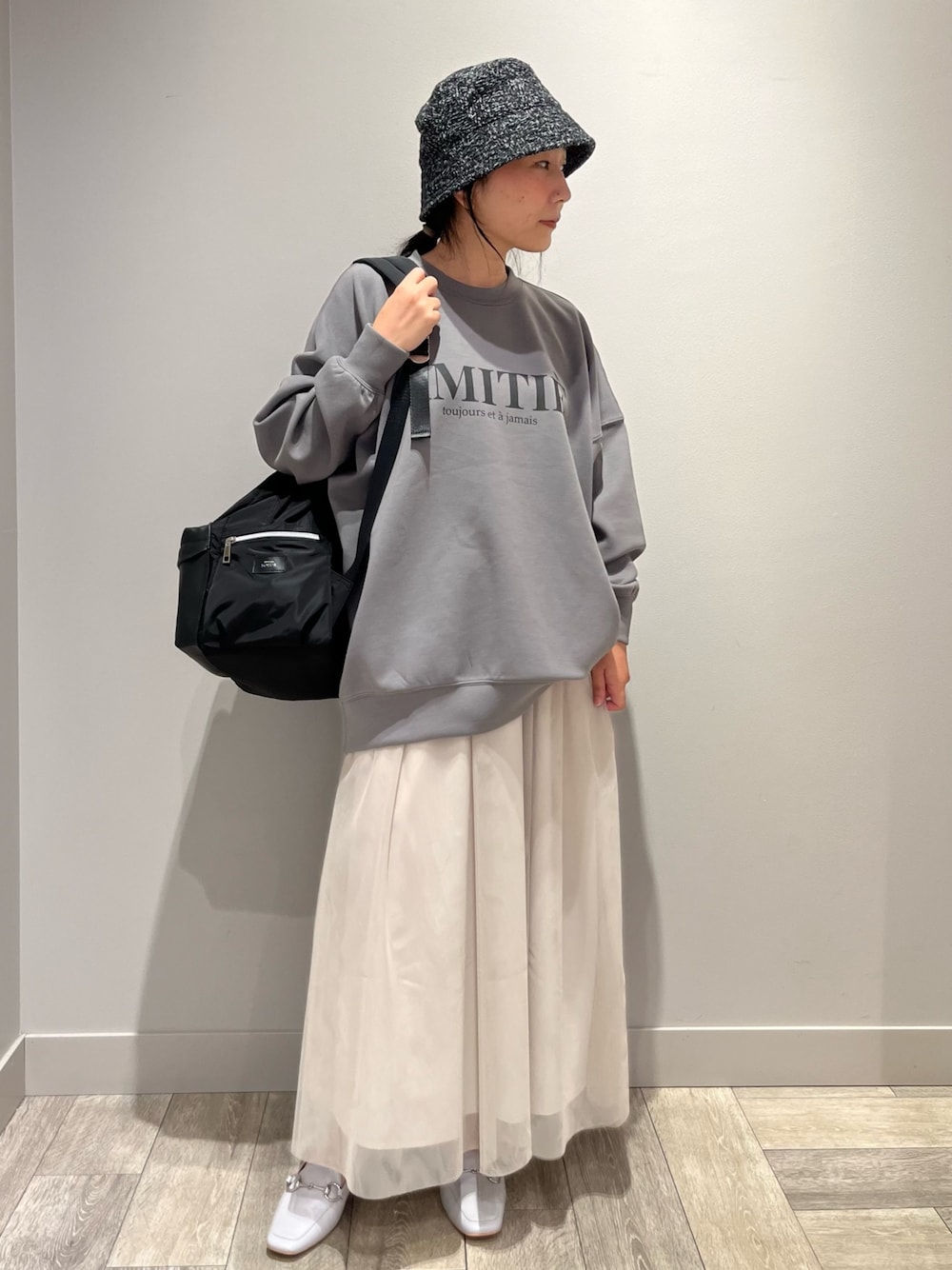 今すぐ使える秋物といえば.スウェット! ボリューム感のあるチュールスカートと合わせれば、相性バッチリ!