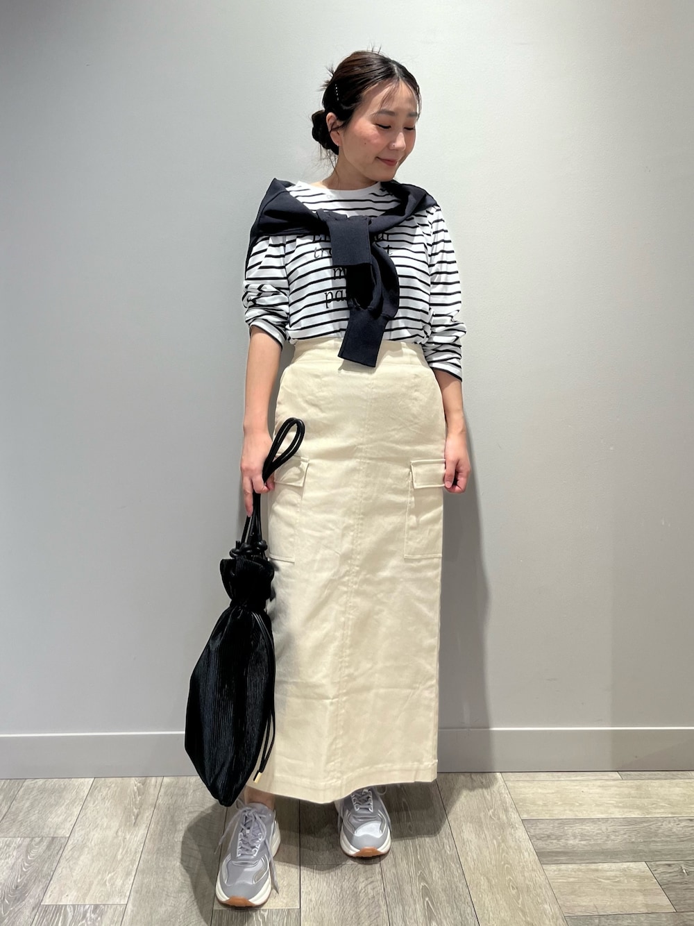 カジュアルになりがちなボーダーTにタイトなロングスカートを合わせてIラインのシルエットで大人な印象に!