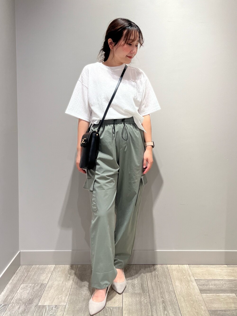 カジュアルになりがちなカーゴパンツは、きれいめ素材を選ぶと大人も着やすいきれいめカジュアルに!