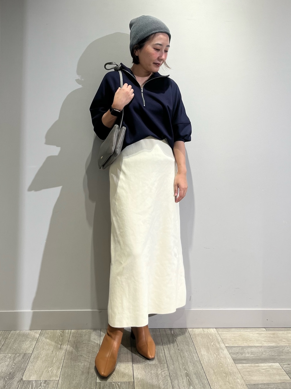 ハーフジップのショートトップスに楽ちん素材のスカートで大人カジュアル!