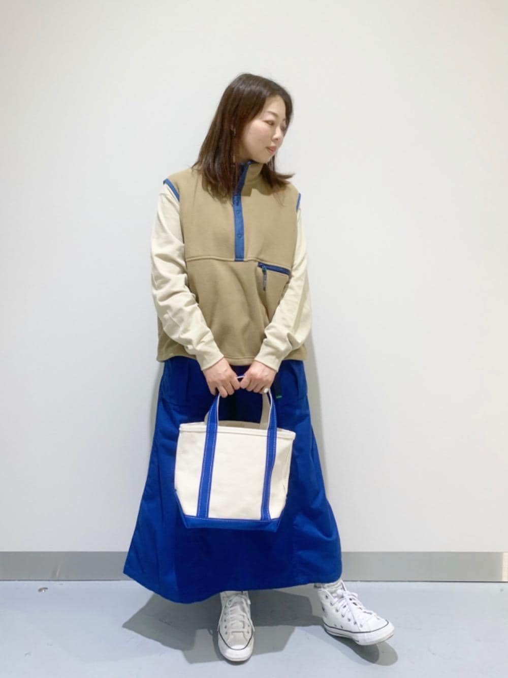 いよいよ冬本番ですね! 本日は配色がかわいい!そして着回しが効く 【ソロン・フリース・ベスト】のご紹介です こちらのベスト、軽くて暖かいのはもちろん、色味が絶妙なんです! ベージュ地にパイピングの鮮やかなブルー。 主役にもインナーにもなる、着回し抜群のアイテムです! ふわっと大きめシルエットがかわいい! 裾にはスピンドルコードが付いているので、ボリューム感を調節できて、風もシャットアウト。 機能面も言うことなしです! 真冬はアウターを重ねて、防寒と衿元のおしゃれを両立できます。 さらにスカートもブルー! エルエルビーンには珍しい、ロングスカート。 大きめのポケットや、ベルトがポイント。 寒い時期はどうしてもダークトーンになりがち。。。 だからこそ目が覚めるような鮮やかな色を投入! この冬はぜひ”色”を取り入れて楽しんでください! 着用リスト トップス:ソロン・フリース・ベスト 65165 beige ウィメンズM ボトムス:ビーンズ・グルカ・スカート 65176 blue ウィメンズM インナー:ユニオン・ロングスリーブ・Tシャツ 65152 beige ウィメンズM バッグ:ボート・アンド・トート 112635 Regatta Blue スモール